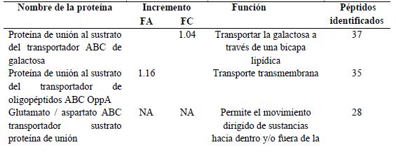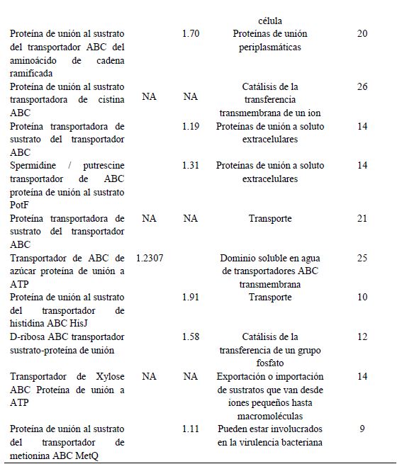Se estudió la influencia de la fuente de P inorgánico en la expresión de proteínas en K. aerogenes, considerada como Bacteria Solubilizadora de Fosfato (BSF). El fosfato de calcio y fosfato de aluminio fueron las únicas fuentes en los cultivos bacterianos. Se lograron identificar un total de doscientos dieciséis proteínas. Bajo las condiciones de experimentación, no se detectaron proteínas únicas para los cultivos en FC o FA. La sobreexpresión de proteínas sólo se consideró cuando se obtuvieron valores mayores a 2. La tabla 5 muestra las proteínas identificadas involucradas en el aprovechamiento del P, como las ABC transportadores. Para este caso, no se observó un cambio de diferencia en la expresión mayor a 2. Además, se observó la presencia de la proteína histidina quinasa Pho y proteína del sistema de transporte específico de fosfato Pho U con un cambio de diferencia (fold) de 1.10 el cual no se considera significativo.