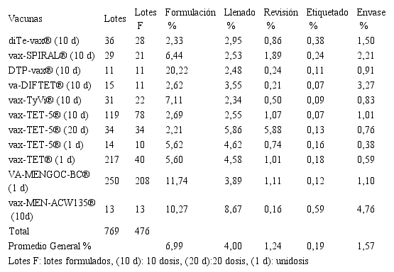 La Tablas 1 y 2 muestran los resultados del porcentaje de mermas por vacunas para cada etapa del proceso de producción; el porcentaje de merma total y las dosis de mermas por lote formulado para cada vacuna, así como la cantidad de lotes de vacunas analizados en el período 2011-2015, excepto para las vacunas diTe-vax®, vax-MEN-ACW135® y vax-TET-5® (20 dosis) que se analizaron en el período 2012-2015 y 2014-2015, respectivamente. Se observó que para la etapa de formulación, las mermas oscilan entre un 2,2% y un 20%. Para la etapa de llenado, los valores de las mermas se encuentran entre un 2% y un 8%; para la revisión, entre un 0,1% y un 1,9%; para el etiquetado, los valores de mermas fluctúan entre un 0,07% y un 0,9% y en la etapa de envase, las mermas oscilan entre un 0,3% y un 4,2%. Estos resultados muestran que la etapa de formulación es la que presenta mayor porcentaje de mermas (6,99%), principalmente por pérdida de lotes de vacunas de DTP-vax® y VA-MENGOC-BC®. Luego le continúa la etapa de llenado con un 4,0% de mermas. Para el resto de las etapas (revisión, etiquetado y envase) las mermas oscilan entre 0,2% y 1,57%.
