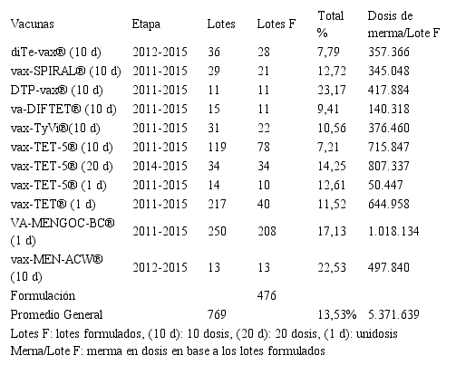Para la actualización de las mermas, se recopiló la información de 770 lotes de producción a partir del 2011 hasta el 2015 para las vacunas que se describirán en el acápite siguiente, con el propósito de obtener el promedio histórico, además se compararon con las del año 2016.
