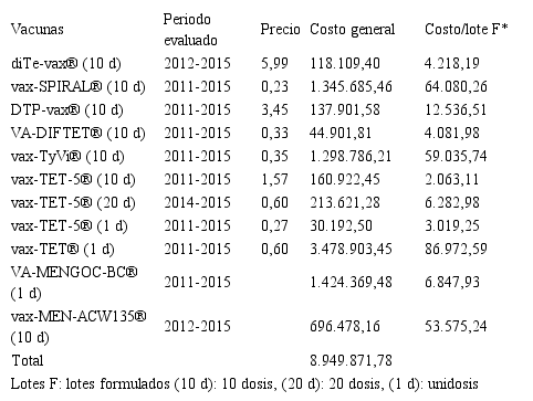 Los resultados del costo general de las mermas obtenidas del proceso de fabricación de vacunas en el período evaluado se observan en la Tabla 3. Los precios son los aprobados para el 2016.(4) Para los casos de las vacunas vax-TET-5® (10 dosis), VA-MENGOC-B® (unidosis) y vax-MEN-ACW135® (10 dosis) son precios ponderados. Haciendo un análisis técnico-económico preliminar, se observa que el costo general de las mermas en este periodo (2011-2015) ascendió a un valor de 8.949.871,79 pesos cubanos, aportado mayormente por las vacunas vax-SPIRAL®, vax-TyVi®, vax-TET® y VA-MENGOC-BC®. Las causas fundamentales son: la pérdida de lotes por contaminación, por ensayos de baja potencia y por errores de mala manipulación, que unido a las mermas planificadas, como las muestras de retención y las enviadas al Centro Estatal para el Control de la Calidad de los Medicamentos (CECMED), órgano regulador de Cuba, constituyen un número no despreciable.