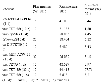 • Los porcentajes de mermas del año 2016 estuvieron por debajo de las mermas históricas, a excepción de la vacuna vax-TET-5® en presentación de 20 dosis.