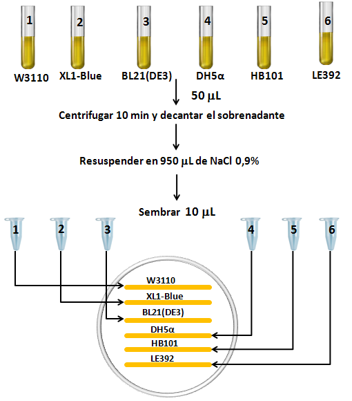 Para la verificación las cepas fueron inoculadas, a partir de bancos conservados a -80ºC, en tubos de ensayo que contenían 5 mL de medio LB suplementado con 0,2% de glucosa y crecidas a 37ºC durante toda la noche. Después del periodo de incubación se trasvasaron 50 µL a tubos eppendorf de 1,5 mL y se centrifugaron durante 15 min en una minicentrífuga de laboratorio, el sobrenadante se decantó y se resuspendió el precipitado en 950 µL de solución salina (NaCl 0,9%) empleando un vortex. De cada suspensión se sembraron 10 µL de las seis cepas en las placas con medios agarizados por el método de trazas de dilución.(14)