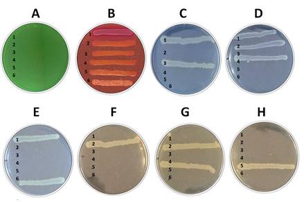 La estrategia general de diseño de medios de cultivos indicadores, puede ajustarse teniendo en cuenta los genes marcadores comunes entre las cepas a verificar. Según el genotipo de las cepas se definieron ocho medios de cultivo diferentes: agar citrato de Simmons, agar MacConkey, medio M9 suplementado con glucosa, medio M9 suplementado con glucosa y tiamina, medio M9 suplementado con glucosa y metionina, medio LB suplementado con tetraciclina, medio LB suplementado con ácido nalidíxico y medio LB suplementado con estreptomicina, en los cuales se observan patrones diferentes de crecimiento (Fig. 2).