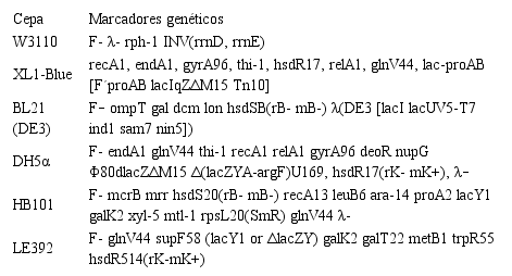 Las cepas de E. coli empleadas en metodologías de ADN recombinante son mutantes desarrollados en la primera mitad del siglo XX, en diferentes laboratorios de investigación.(1) Estas cepas son comercializadas por diferentes proveedores con una descripción de sus genotipos.