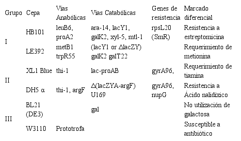 La DH5 α también requiere arginina para su crecimiento en medio mínimo. La cepa HB101 requiere leucina y prolina para crecer en medio mínimo y la LE392 requiere metionina. Una de las pruebas bioquímicas que tipifica los diferentes serotipos de la bacteria E. coli, es la capacidad de degradar lactosa como única fuente de carbono y energía. Muchas de las cepas de uso en Biología Molecular son incapaces de degradar la lactosa o la galactosa, por lo que esta propiedad puede ser seleccionada como un indicador de la no presencia de contaminantes cuando trabajamos con mutantes. La presencia de la mutación gyrA96 le confiere a las cepas DH5 α y XL1 Blue resistencia al ácido nalidíxico y el transposón Tn10 confiere resistencia a tetraciclina en la cepa XL1 Blue. La cepa HB101 muestra resistencia a la estreptomicina por la presencia de la mutación rpsL20. La selección de esta combinación de marcadores hace que puedan definirse medios donde el patrón de crecimiento sea diferente.