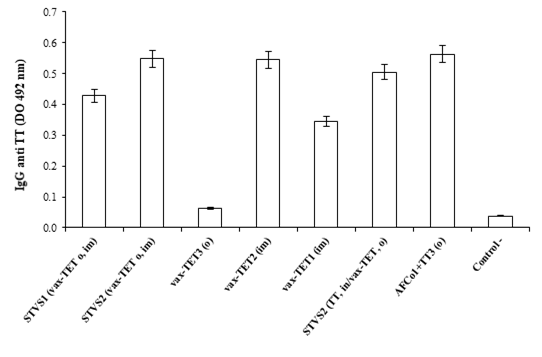 Por otra parte, vax-TET® en una sola dosis indujo una respuesta significativamente menor (p<0,001) que con dos dosis o SinTimVaS. Tres dosis orales de vax-TET® espaciadas 7 días no indujeron IgG anti TT sistémico (Fig. 1).