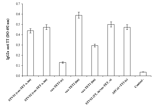 Todas las formulaciones que indujeron IgG anti TT indujeron respuesta de IgG2a (Fig. 2) e IgG1, lo que se corresponde con la gran inmunogenicidad del TT y sus vacunas y su inmunopolarización hacia un patrón Th1. No se logró determinar la inducción de respuesta de IgA específica en saliva en los grupos inmunizados con SinTimVaS en una o dos dosis ni tres dosis orales de vax-TET®. No obstante, al cambiar el adyuvante de alúmina por AFCo1 coadministrado con TT en 3 dosis orales se indujo similares respuestas de IgG e IgG2a anti TT sérica (Fig. 1 y 2) que con dos dosis de vax-TET im y se adicionó la inducción de IgA anti TT en saliva (p<0,001).