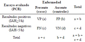 Se estimaron los siguientes indicadores: sensibilidad (S), especificidad (E), valor predictivo positivo (VPP), valor predictivo negativo (VPN) y la razón de verosimilitud (RV) positiva y negativa, teniendo en cuenta los individuos con respiración oral y ronquidos (enfermedad presente o casos) y los controles sin dicho cuadro clínico y se relacionaron con el IAH alcanzado mediante PCR. Nos auxiliamos de la siguiente tabla de contingencia.11