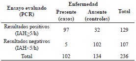 Los indicadores estadísticos básicos para evaluar el desempeño diagnóstico de la PCR pueden observarse en la Tabla 3. Se alcanzó una excelente sensibilidad y una aceptable especificidad.