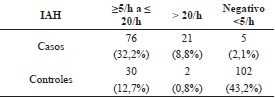 El IAH fue positivo en 129 pacientes (54,6%); de ellos correspondieron a los casos 97 (41,1%) y a los controles 32 (13,5%) como se aprecia en la Tabla 1. La positividad de los controles puede estar relacionada a otras causas que alteren el IAH o deficiencias en la obtención de datos. De igual forma no se encontraron referencias similares para estas variables.