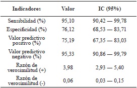 Los indicadores estadísticos se estimaron teniendo en cuenta los valores positivos y negativos para los casos y para los controles respectivamente (Tabla 1).