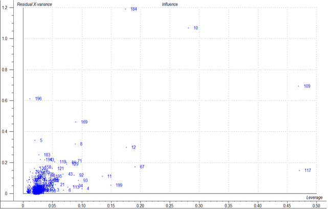 En el gráfico de la influencia (Fig. 2), se pueden observar muestras con elevado error residual (10 y 184) y muestras con elevado distanciamiento del comportamiento del resto de las muestras (109 y 117); estas muestras constituyen puntos discrepantes (outliers) pero no son peligrosos, por lo que no fueron eliminadas del modelo al contener información útil del proceso.