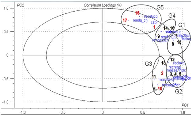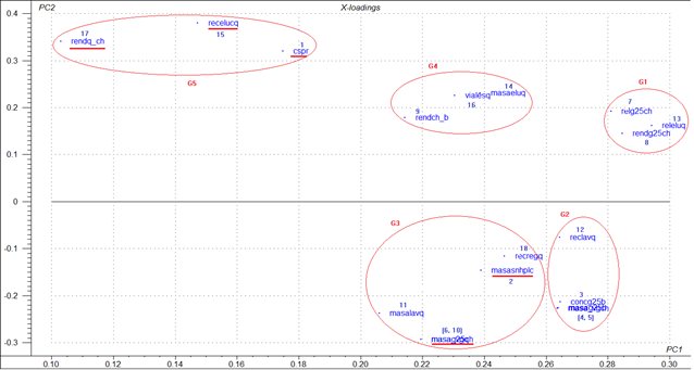 En el gráfico de los pesos, que se presenta en la Figura 4, se observa que ninguna de las variables está cercana del punto de origen de los ejes de coordenadas y todas son significativas en el aporte a uno de los dos componentes seleccionados. Se tienen agrupamientos de las variables, las que han quedado aglomeradas formando 5 grupos que se indican; de estos, los grupos del 1 al 4 contribuyen significativamente al primer componente y el grupo 5 al segundo componente.
