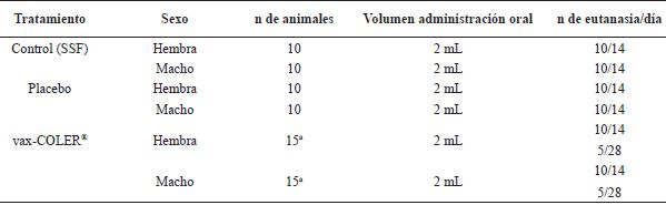 Se empleó la vía oral por ser la propuesta a utilizar en humanos, en dosis y volumen descritos anteriormente; teniendo en cuenta el peso y las relaciones alométricas entre el hombre y el biomodelo experimental utilizado. Se consideró que la dosis aplicada permite evaluar la seguridad del candidato vacunal con un margen satisfactorio,12 tomando como promedio animales de 200 g de peso vivo, esta dosis representó más de 300 veces la dosis humana de un individuo de 70 kg de peso. El candidato vacunal se aplicó con una cánula curva, con punta roma (medida: 16x3” (76,2 MM) W/3, China) diseñada para la administración oral en ratas y en la Tabla 2 se resume el diseño experimental.
