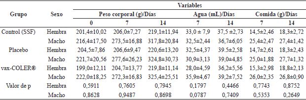 No se registraron síntomas clínicos ni muertes; mientras que el peso corporal, luego de su registro al comienzo del ensayo y después de aplicar el producto a las ratas, fue como promedio 202 g en las hembras y 220 g en los machos; todos los animales incrementaron el peso corporal durante el tiempo que duró el ensayo, siendo los machos los que mostraron un ritmo de crecimiento mayor (interacción sexo-tiempo significativa, p=0,031). Sin embargo, no fue significativa la interacción entre los factores sexo y tratamiento en cuanto a peso vivo se refiere (p≥0,05). En la Tabla 3 se muestra que no se evidencian diferencias significativas entre los grupos experimentales.