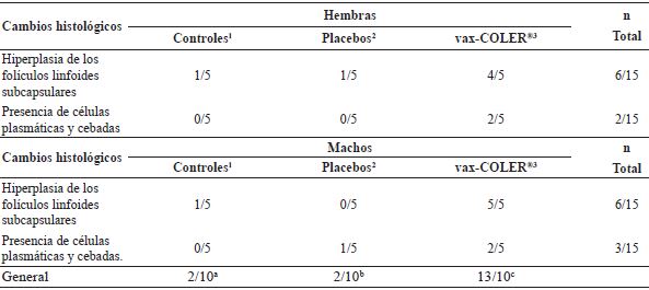 La frecuencia de estos cambios en los ganglios mesentéricos fue significativamente mayor en el grupo de animales vacunados, en comparación con los placebos y controles (Tabla 4).
