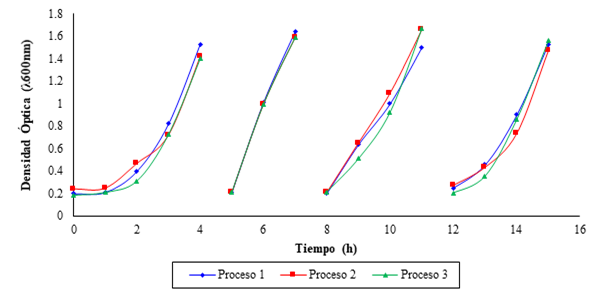 Las curvas de crecimiento en la etapa 1 en los tres procesos se comportaron de manera muy similar. En esta etapa, se observa el período de adaptación durante la primera hora, dado principalmente por el cambio del medio de cultivo, de sólido a líquido, ya que a pesar de que ambos son medios enriquecidos, su composición química y consistencia es diferente, y por tanto cambian las rutas metabólicas involucradas en la adquisición y asimilación de los nutrientes. Durante esta fase de adaptación o latencia, las bacterias se adaptan a las nuevas condiciones de crecimiento, al mismo tiempo que ocurre un proceso de maduración y no tienen la posibilidad de dividirse. Se produce la síntesis de ARN, enzimas y otras moléculas que les permiten multiplicarse en el medio de cultivo fresco, aumentando la actividad metabólica.5,7