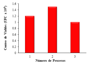 En todos los procesos, se obtuvieron curvas de crecimiento similares (Fig. 1) y se obtuvieron valores de viabilidad máxima superior a 1 x 109 UFC/ mL en la última etapa (Fig. 2).