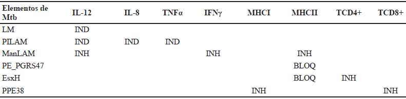 Lipomanano (LM), LAM recubierto de fosfoinositol (PILAM) y ManLAM, participan en la modulación de la producción de citoquinas y en la RI adaptativa. De hecho, se ha demostrado que LM induce la producción de IL-12, mientras que para PILAM se ha evidenciado que induce la secreción de IL-8, IL-12, TNFα.46,47,48 Por el contrario, las investigaciones han confirmado que ManLAM no induce la secreción de IL-12 en el macrófago.46,47,48,49 La IL-12 juega un papel fundamental en la RI de tipo Th1, por lo que el hecho de no ser inducida por ManLAM indica una manera de supervivencia de Mtb, ya que modula a su favor la respuesta de células T. Por su parte, existen otras evidencias de que ManLAM inhibe la respuesta celular por supresión de la expresión de MHC-II e IFNγ.48,49 En efecto, el hecho de inhibir la producción de IFNγ afecta importantes procesos celulares durante la RI como la producción de MHC-I, MHC-II, ROI y RNI.50 Asimismo, la supresión de MHC-II impide la presentación de antígenos por las células dendríticas, y en consecuencia, se produce una RI adaptativa ineficiente (Tabla 1).