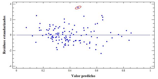En la Figura 1 se muestra el gráfico de los puntos residuales, donde se aprecia que existe una muestra, que corresponde a la 74, con alto valor residual. Durante el proceso de purificación no se reportaron anomalías con esta muestra por lo que no se eliminó, ya que podía contener información significativa para la investigación.