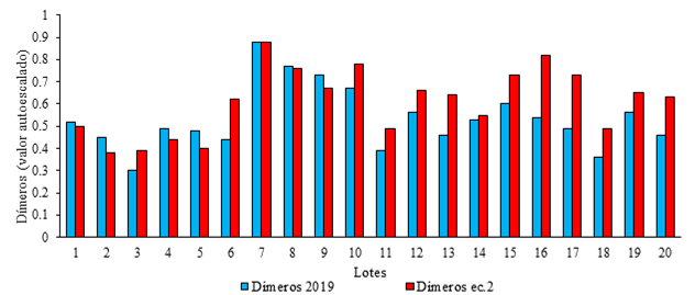 Para la validación del modelo se emplearon los datos del proceso de purificación de los lotes producidos en el año 2019 (20 lotes). La comparación entre el resultado de los dímeros determinados en el proceso luego de aplicar el autoescalado y los calculados utilizando la ecuación 2 se muestran en la Figura 2. Se calculó el error relativo entre ellos para uno de los 20 lotes resultando un error relativo medio de 17,36%.