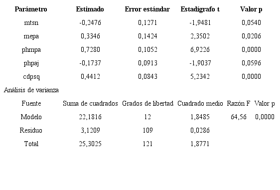 En la obtención del modelo matemático que relacione las principales variables del proceso con la formación de dímeros se emplearon 121 muestras y 12 parámetros de calidad. El análisis de varianza reportó un valor de p de cero, siendo este menor que 0,05; lo cual significa que el modelo explica más variaciones de la variable de respuesta de lo que podría esperarse de fenómenos aleatorios15 y que existe una relación estadísticamente significativa entre las variables para un 95% de confianza. Se eliminaron las variables con un valor de p mayor que 0,05, por no ser estadísticamente significativos para un 95% de confianza. Dado lo cercano al valor p de 0,05 de las variables mtsn y phpaj se decidió mantenerlas en el modelo. En la Tabla 1, se muestran las variables con sus respectivos estimados y estadígrafos, así como el análisis de varianza del modelo.