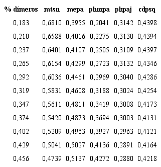 Se calculó el error de predicción del porcentaje de dímeros para cada corrida, comparando el resultado del modelo obtenido según la ecuación 1, con el de la base de datos. El error relativo medio obtenido fue de 36,78%. Con el objetivo de disminuir este error se eliminaron las corridas que presentaron un error relativo superior al 40% y con esta base de datos reducida de 83 muestras se repitió el ajuste del modelo.