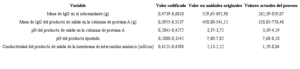 Se determinó el intervalo en que deberán encontrarse los valores de las variables pH del producto de salida en la columna de proteína A, del producto ajustado, masas de IgG en el sobrenadante y en el eluato de proteína, y conductividad del producto de salida en la membrana de intercambio aniónico para lograr valores del porcentaje de dimerización entre 2 y 3%.