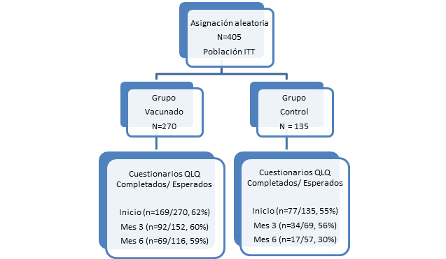 Entre el 5 de julio de 2006 y el 3 de julio de 2012 se incluyeron 405 pacientes. La población por intención de tratar (ITT) estuvo conformada por un total de 270 pacientes en el grupo tratado y 135 en el GC. Las instituciones participantes fueron: Antonio Luaces Iraola (10), Benéfico Jurídico (31), Camilo Cienfuegos (21), Celestino Hernández Robau (12), Centro de Investigación Médico Quirúrgico (4), Carlos Manuel de Céspedes (15), Celia Sánchez (7), Ernesto Guevara de la Serna (9), Gustavo Aldereguía (5), Hermanos Ameijeiras (52), III Congreso (29), Instituto Nacional de Oncología y Radiobiología (4), Juan Bruno Zayas (11), José Ramón López Tabranes (32), Manuel Ascunce Domenech (44), María Curie (10), Salvador Allende (29), Saturnino Lora (28) y Vladimir Ilich Lenin (52).