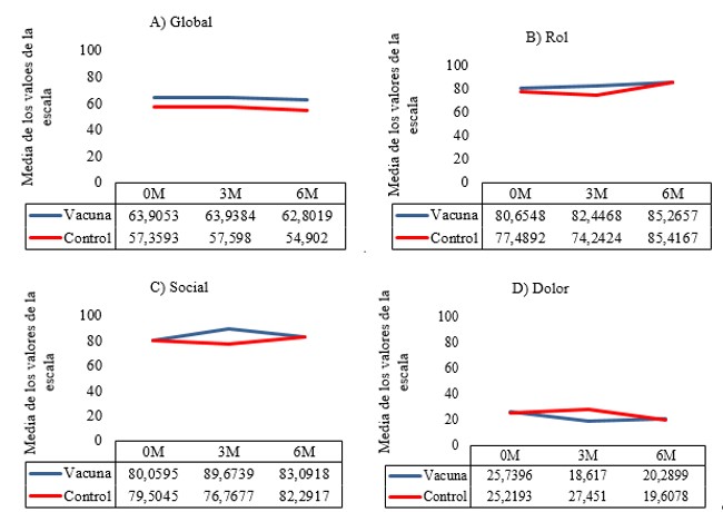 El funcionamiento social también mostró altos valores medios para ambos grupos de tratamiento, superiores a 66,7 puntos en cada momento de seguimiento, los cuales se corresponden con niveles de funcionamiento social altos o saludables. Estos valores fueron superiores para el GV en todos los momentos de evaluación, aunque sin diferencias estadísticamente significativas (p>0,05), con excepción del mes 3 donde el grupo tratado mostró mejores resultados que los controles con un nivel alto de significación estadística (p=0,005), (Fig. 2C). Esto ocurre cuando los pacientes entran en la etapa del mantenimiento, luego de un periodo finalizado de inducción, que se corresponde con el punto de inflexión en el cual comienzan a levantar títulos de anticuerpos y reducir los niveles de EGF en suero. Por otro lado, para el GV se obtuvo un incremento no significativo (p=0,279) de 3 puntos al comparar el mes 6 con el nivel basal, mientras que en el GC este incremento fue de 2,7 puntos (p=0,37).