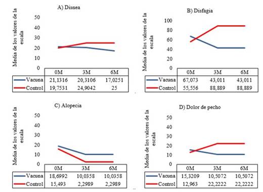 En el síntoma alopecia no se determinaron diferencias estadísticamente significativas (p>0,05) ni en el nivel basal, ni en el resto de los tiempos evaluados en los resultados de ambos grupos (Fig. 3C). Para los pacientes vacunados los valores del síntoma alopecia mostraron una disminución absoluta significativa de (p=0,045) de 8,6 puntos al comparar los meses 3 y 6 con el nivel basal.