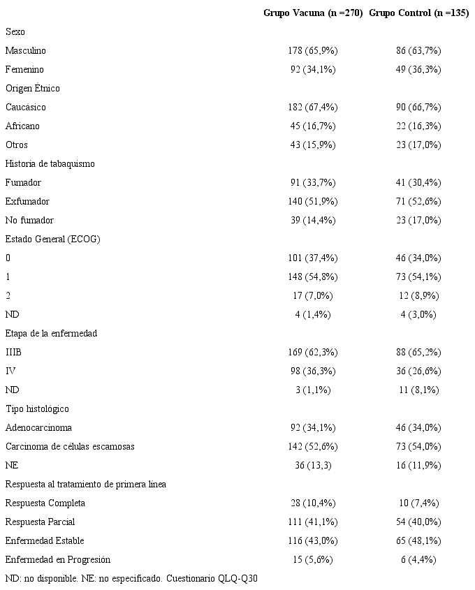 Las características demográficas y clínicas basales de los pacientes fueron similares en ambos grupos (Tabla 1), lo que se corresponde con otros estudios realizados.11,12,13 La mediana de supervivencia en el ensayo para el caso de los pacientes que recibieron la vacuna fue de 10,83 meses (95% IC: 8,95-12,71) y 8,86 meses (95% IC: 6,69-11,03) para los controles (datos no mostrados). Dichos resultados son similares a los reportados por otros autores.14,15,16