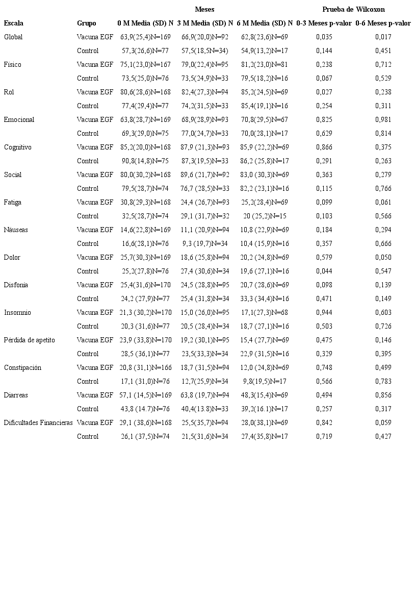 De manera general, como se mostró en cada uno de los parámetros del cuestionario EORTC QLQ-C30, se evidenció que, aunque no se establecieron diferencias significativas de manera global entre los parámetros analizados, de manera absoluta se arrojó un beneficio en cuanto a CV para el GV con la vacuna CIMAvaxEGF® en las cinco escalas funcionales: funcionamiento físico, rol funcional, funcionamientos cognitivo, emocional y social, en las tres escalas de síntomas: fatiga, dolor y náuseas-vómitos.