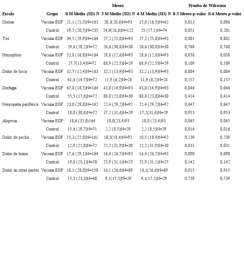 Por su parte, el cuestionario EORTC QLQ-LC13 también evidenció ventajas para el GV, aunque no en todas con significación estadística, pero si desde el punto de vista de beneficio clínico. Se señala como significativo que disminuye la hemoptisis en el grupo con tratamiento de la vacuna, así como la disfagia, la tos y la disnea, observándose un empeoramiento en el GC el cual no recibió el tratamiento en investigación.