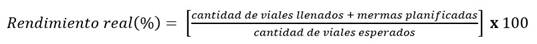 Se calculó la capacidad real de la máquina teniendo en cuenta la cantidad de viales llenados por hora, obtenidos igualmente de los protocolos impresos que brinda el equipo. Se evaluó, además, el rendimiento operacional del proceso y se comparó con el anterior, utilizando la ecuación 1: