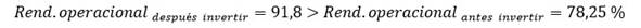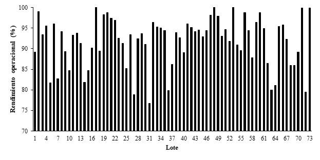 Puede observarse que la mayoría de los lotes se encuentran por encima del 85% de rendimiento operacional. Calculando el rendimiento promedio y comparando con el obtenido en los 73 lotes antes de realizar la inversión, se obtiene: