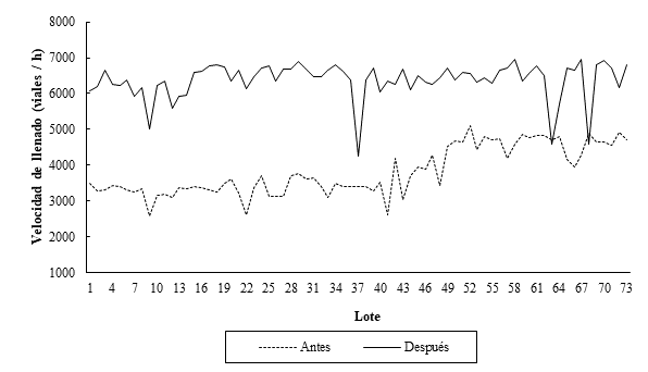 El comportamiento de las velocidades de llenado antes y después de ejecutada la inversión, se muestra en la Figura 1, donde se evidencia el considerable aumento que lote a lote ha mostrado la nueva máquina llenadora.
