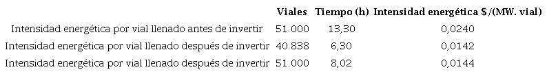 El tiempo promedio de llenado calculado es de 13,3 horas para una cantidad de viales obtenidos de 51.000, antes de realizado el cambio. Después de ejecutada la inversión, se llenan alrededor de 40.838 viales como promedio, en un tiempo medio aproximado de 6,3 h. El tiempo de duración de los llenados disminuye tras la puesta en marcha del nuevo equipamiento. Para comparar los resultados se consideró que se mantiene constante la cantidad de unidades a producir en la nueva máquina llenadora, de donde se requerirían 8,02 h para el llenado de 51.000 viales. La intensidad energética, calculada según la ecuación 2, se presenta en la Tabla 1.