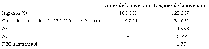 Para evaluar la relación beneficio/costo (RBC) se calculó la relación incremental, la cual es una técnica importante dentro del ámbito de la teoría de la decisión. El análisis se realizó suponiendo que se deseara mantener el nivel de producción de viales actualmente con la alternativa implementada, y teniendo en cuenta el pago al cliente por concepto de pérdidas reales antes y después de la inversión.7