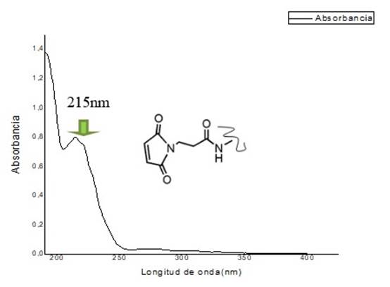 El barrido espectrofotométrico del PRP2 desde 200 a 400 nm mostró un máximo de absorción alrededor de 215 nm de longitud de onda según se observa en la Figura 1.