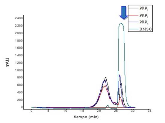 La evaluación de las impurezas en el PRP (DMSO u otras) se realizó en los tres lotes de PRP en la columna SuperdexTM 75 10/300 GL Increase manteniendo para el análisis las condiciones empleadas para determinar el perfil de elución. La muestra aplicada fue de 100 µL de DMSO puro (98%) a una concentración de 4,5 % (0,049 g/mL) e igual volumen de PRP disuelto a una concentración de 1,0 mg/mL.