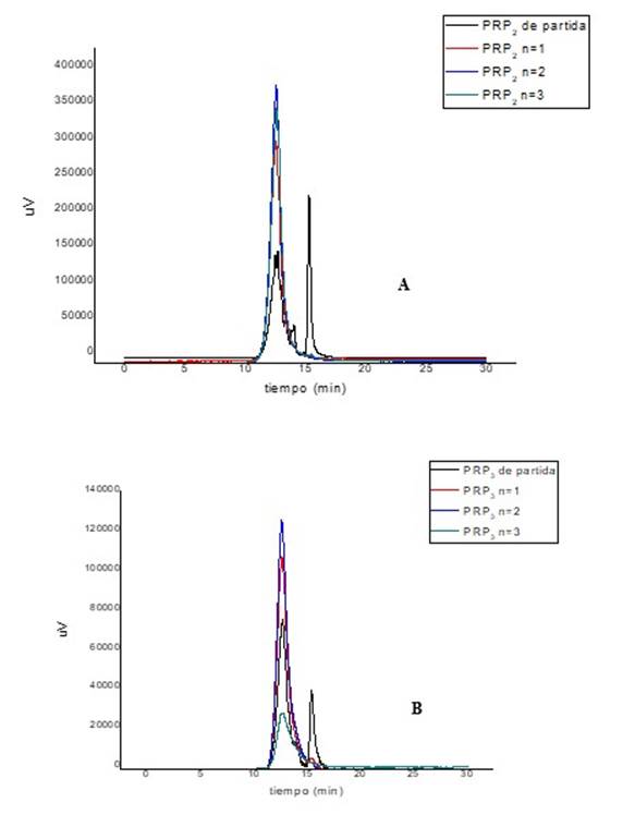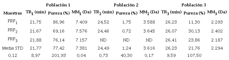 La Tabla 1 muestra la distribución más probable de pesos moleculares según el tiempo de retención y el % de pureza de los tres lotes de PRP expresada, esta última, como el área bajo la curva.
