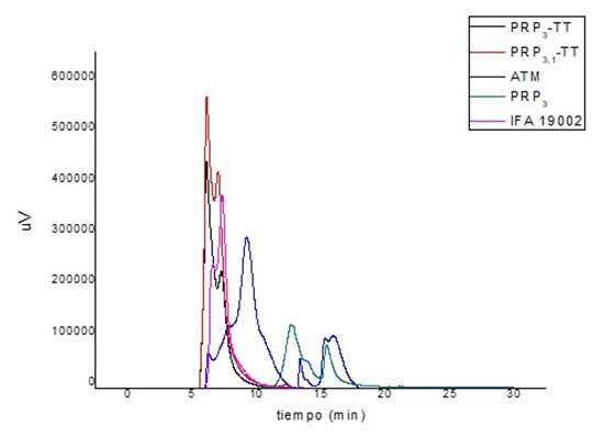 En el cromatograma se observan perfiles de elución muy semejantes entre los conjugados PRP3-TT y PRP3.1-TT y de estos a su vez con el IFA 19002 control, indicativo de que se logró reproducir a escala de laboratorio el proceso industrial. En este caso predomina una sola población correspondiente al conjugado que se filtró por una membrana de corte de 30.000 Da donde se elimina el PRP libre y otras impurezas. El tiempo de retención promedio fue de 6,10 min ± 0,003, el cual disminuye en comparación al obtenido para el PRP de partida, producto de la unión covalente al TT con un valor de peso molecular reportado de 150.000 Da.