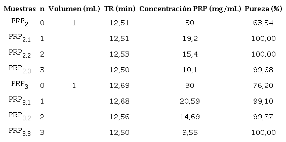 Los lotes de PRP seleccionados para este estudio fueron el PRP2 y PRP3 a una concentración de 30,0 mg/mL en un volumen de 1 mL. Para la purificación las muestras se filtraron en un Amicon Ultra-15 (Alemania) de 2.000 Da de tamiz molecular, a 2.330 x g, con un tiempo de filtración de 2,5 h. Al final de cada lavado, se ajustó el volumen a 1 mL y se determinó la concentración de PRP mediante el ensayo de orcinol11 y la pureza por cromatografía de exclusión molecular en una columna YarraTM SEC 2000 (Phenomenex, EE UU). El volumen de muestra aplicado fue de 50 µL a una concentración de 1 mg/mL. El flujo empleado fue 0,8 mL/min a una presión máxima de 1,8 MPa durante 17 min a temperatura ambiente. Las muestras se midieron a la longitud de onda de máxima absorción del PRP. La fase móvil empleada fue una solución tampón a pH=7,0 (100 mM NaH2PO4, 150 mM NaCl). La pureza del PRP se determinó como el porciento de área bajo la curva en el tiempo de retención.