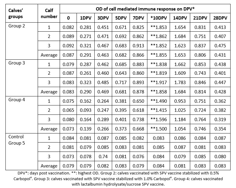 The highest level of cell proliferation was determined at day 10 in all vaccinated groups. Increasing mean OD values (1.855 and 1.858) were observed in groups 2 and 3 vaccinated with 0.5 and 1% Carbopol® stabilized SPV vaccines, respectively. Mean OD 1.500 was obtained for calves vaccinated with lactalbumin hydrolysate/sucrose stabilized SPV vaccine (group 4), while low OD (that not exceed 0.087) was read in control non-vaccinated (group 5), as shown in Table 4.