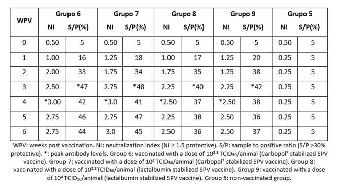 Group 6: vaccinated with a dose of 103.5 TCID50/animal of Carbopol® stabilized SPV vaccine.