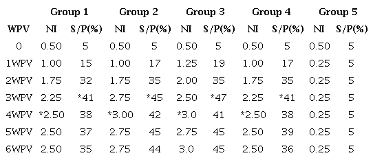 The results of mean NI and S/P ratio obtained for different doses of SPV vaccines are shown in Table 5. Protective levels of antibodies (NI=3 and S/P ratio (47% and 48%) were induced in calves vaccinated with 103.5 TCID50 and 104 TCID50 0.5% carbomer stabilized SPV vaccines (groups 6, 7), respectively; while in calves vaccinated with the 103.5TCID50 and 104TCID50 lactalbumin hydrolysate/sucrose stabilized SPV vaccines (groups 8 and 9) the detected NI value was 2.5, in both groups and the S/P ratio was 40% and 42%, respectively. The optimal dose of choice of the SPV vaccine was 103.5 TCID50/animal.