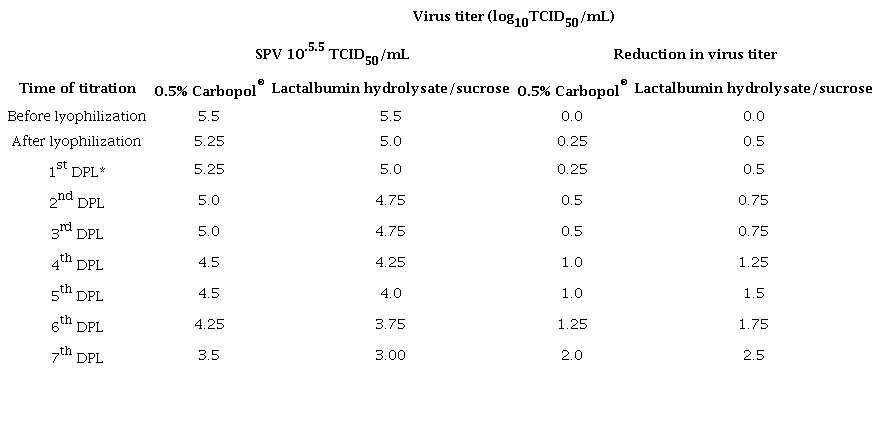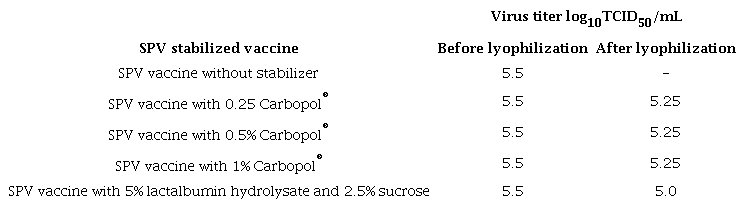 Stabilized SPV vaccines prepared with different concentrations of Carbopol® showed the same reduction in virus titer (0.25 log10TCID50/mL) after lyophilization, while reduction in titer was higher (0.5 log10TCID50/mL) when lactalbumin/hydrolysate sucrose stabilizer was used (Table 2).