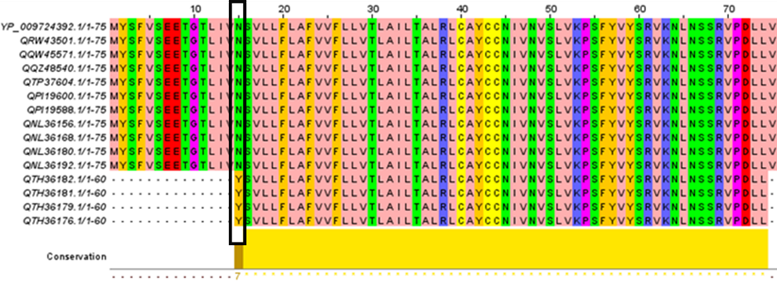 MSA of 14 E proteins were compared with the wild type (Fig. 1). The findings revealed that the preservation rate for E protein was 98.66 percent due to the appearance of a new mutation (N15Y) in four of the 14 strains studied. In this mutation, the amino acid asparagine is substituted by tyrosine.