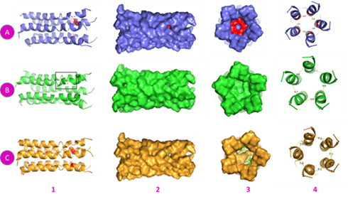 A pentamer structure of E protein (PDB ID: 7K3G) consists of five chains. The mutation was first loaded onto one chain, then onto all links. By homology modeling and constructing the topology structure, we established that there is a difference in how a mutation affects the overall shape of the protein, especially if the mutation occurs in all chains. The new protein has a completely different topology from the old one, which has an effect on the protein and, of course, the virion particle (Fig. 2).